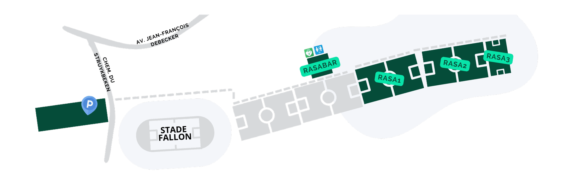 - 2e à gauche – parking en face du stade Chemin du Struyckbeken.